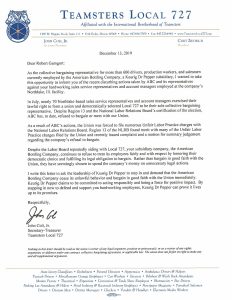 On Friday, December 13, Teamsters Local 727 Secretary-Treasurer John Coli, Jr., wrote to top Keurig Dr Pepper executives and the Company’s Board of Directors to notify them of the unlawful behavior of their subsidiary the American Bottling Company. In his letter, Secretary-Treasurer Coli informed Keurig Dr Pepper leadership of Northlake-based sales service representatives’ and account managers’ election of Local 727 as their sole collective bargaining representative last July, as well as ABC’s subsequent, and ongoing, refusal to bargain in good faith with the Union.